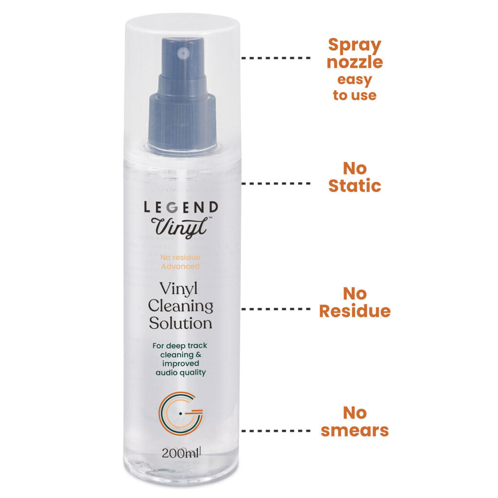Our Cleaning solution has been specially formulated to clean dust, and oils and also remove static which can all impair the sound quality of your vinyl. Our carefully balanced formula is a blend of a quick dry ‘no residue’ degreaser combined with anti-static and anti-bacterial agents to ensure a thorough clean and degrease. This 6-in-1 cleaning product has everything you need for regular cleaning of your records, guaranteeing long-lasting enjoyment of your music.